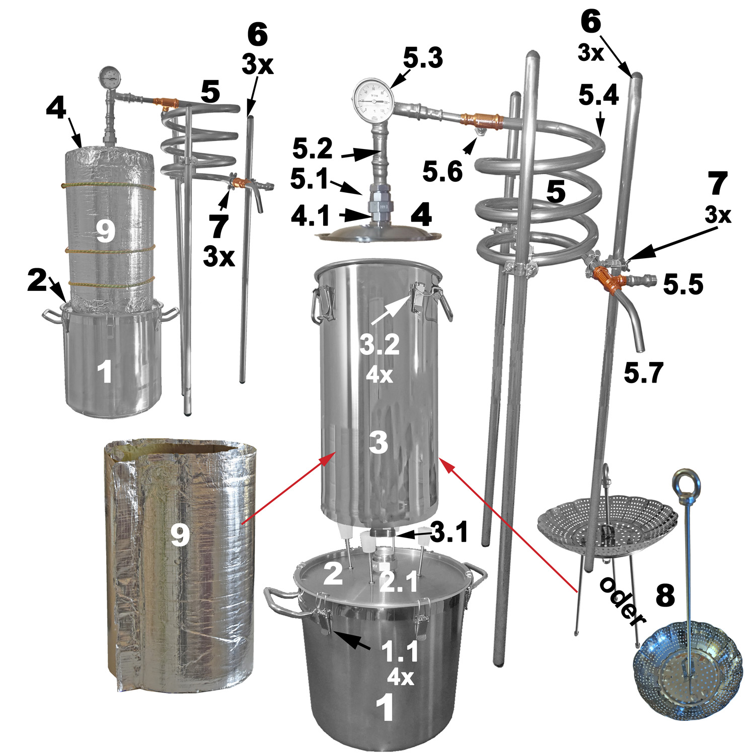 - Der Wasserzulauf beginnt am Kühler bei 5.5. Hier benötigt man am Schlauch eine 1/2" Schlauchverschraubung. Das Kühlwasser strömt dann zwischen Rohrseele und Rohrmantel aufwärts in entgegengesetzter Richtung zum Destillat und tritt bei 5.6 aus. Auch hier benötigt man eine 1/2" Schlauchverschraubung.