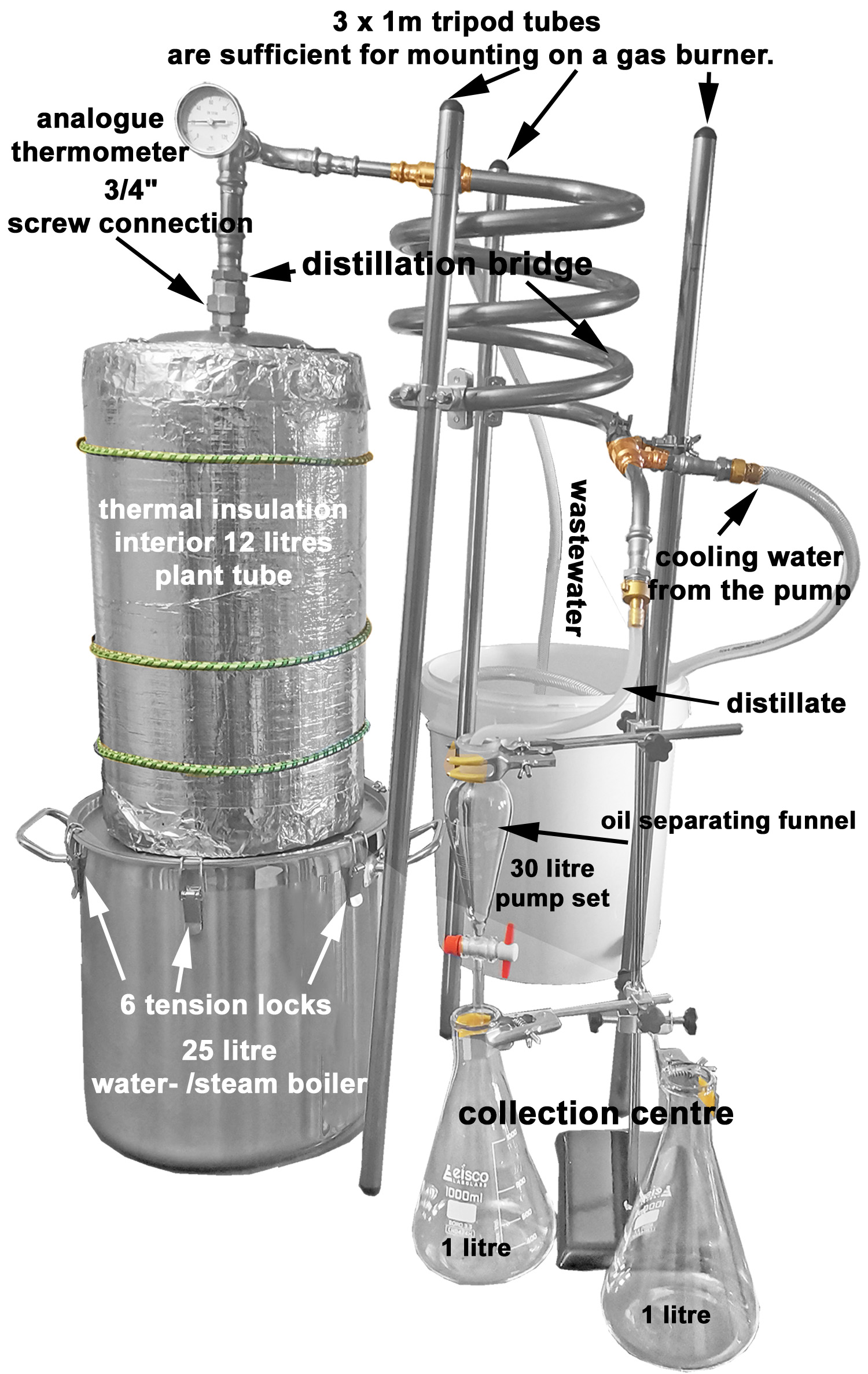 Aufbau mit Isolierung im Betrieb mit Kühlwasserversorgung und Hydrolat-Sammelstation